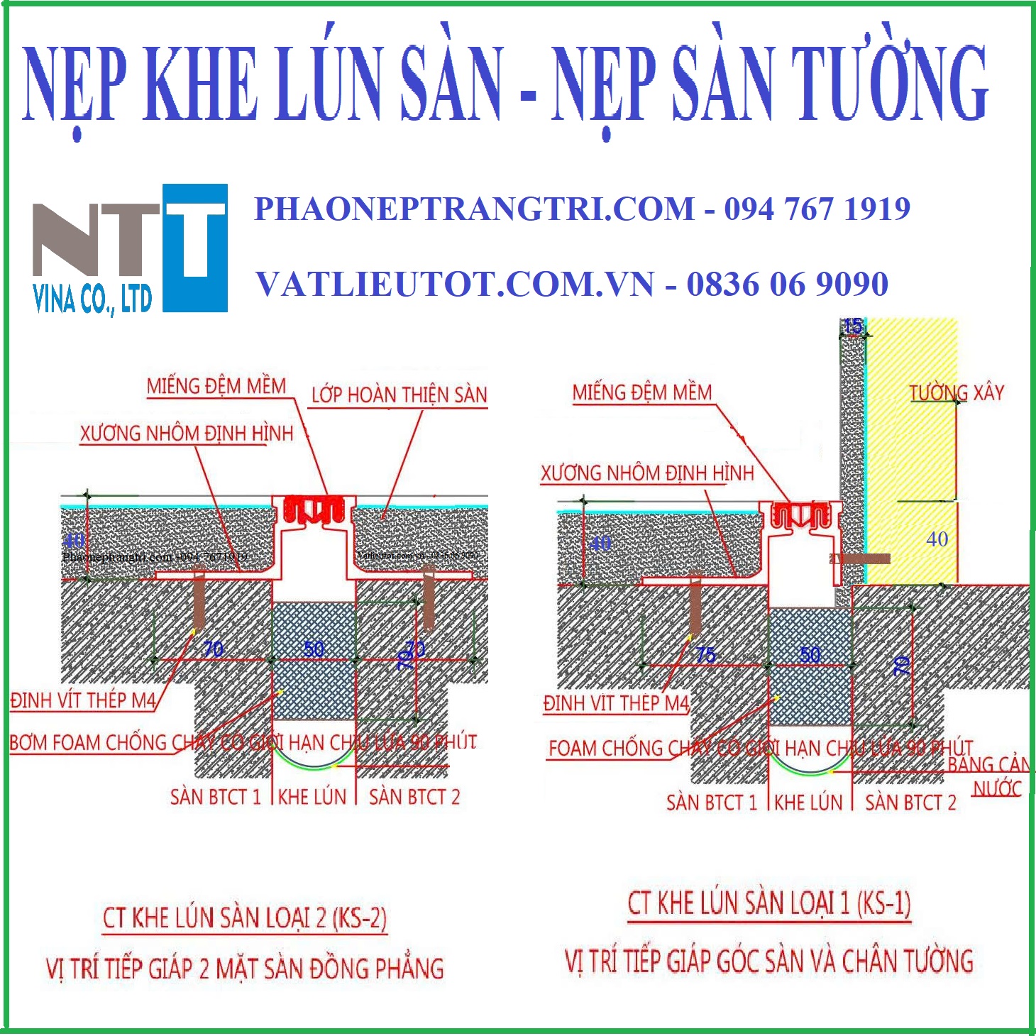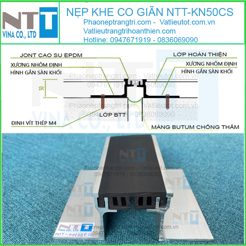 - Tên gọi thông dụng: Nẹp khe lún sàn KN50cs, nẹp khe co giãn KN50cs, Nẹp khe nhiệt KN50cs