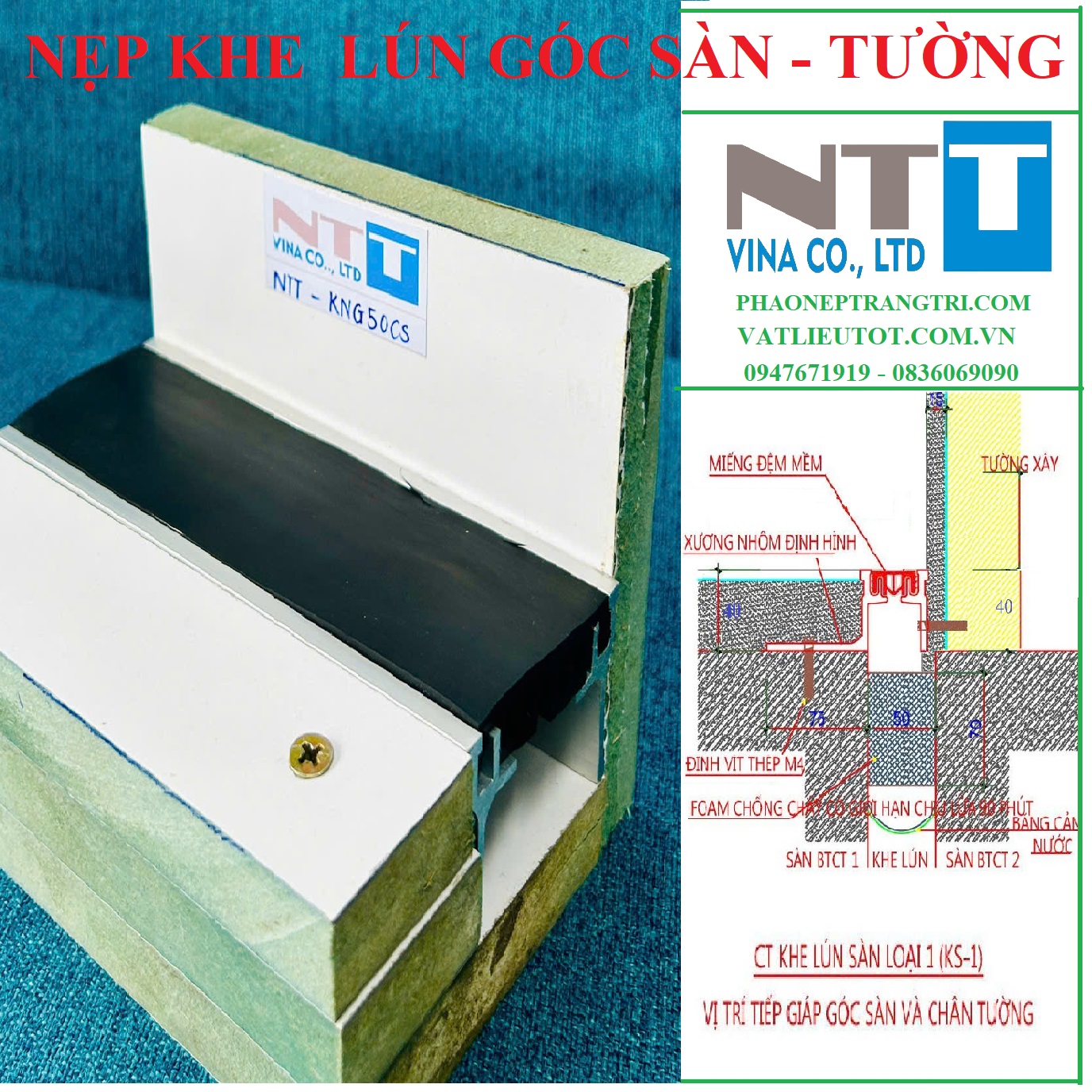 KNG50CS được thiết kế đặc biệt để xử lý khe lún tại các góc (tiếp giáp giữa các mảng kết cấu), cũng như khe co giãn do nhiệt độ. Cấu tạo gồm ray nhôm (một phần gắn sát vào tường, một phần gắn sàn) + ron cao su EPDM làm cầu nối che khe, đảm bảo sự linh hoạt chuyển vị, ron có chân răng cưa để dắt vào khe hở, giữ kết cấu chắc chắn.