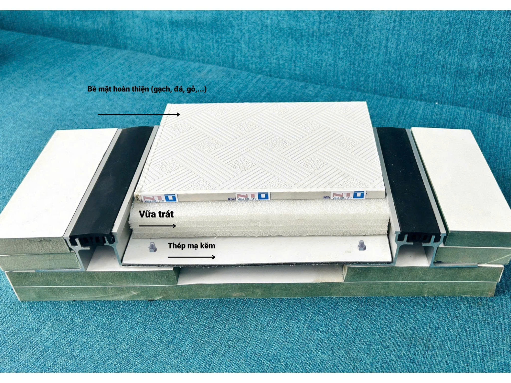 - Tấm thép mạ kẻm: Có chức năng bặt nối giữa hai ray nhôm phía trong lắp sát đối xứng hai bên khe lún, giữa hai ray nhôm này với tấm thép chúng ta bắt vít hoặc bulong ngắn cố định tạo thành một khối trông giống như hình chữ U. Mục đích chính của chữ U này là để đỡ các vật liệu như vữa xi măng, keo dán gạch, gạch lát hoặc các vật liệu hoàn thiện bề mặt