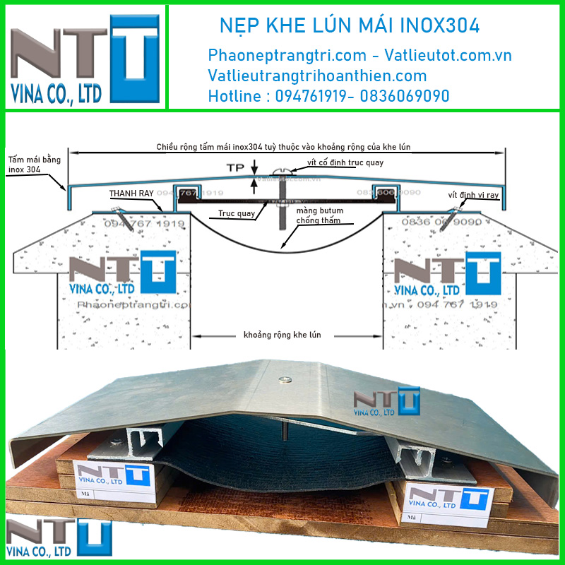 • Cấu tạo thường gồm: tấm inox 304 hình mái — có mép gập xuống để che chắn nước mưa và gió — ray nhôm định hình dẫn hướng, cầu trượt/ trục quay co giãn, vít/ đinh inox liên kết, màng bitum chống thấm… giúp nẹp có thể “giãn nở/ co lại” theo biến đổi nhiệt độ & chuyển vị công trình.