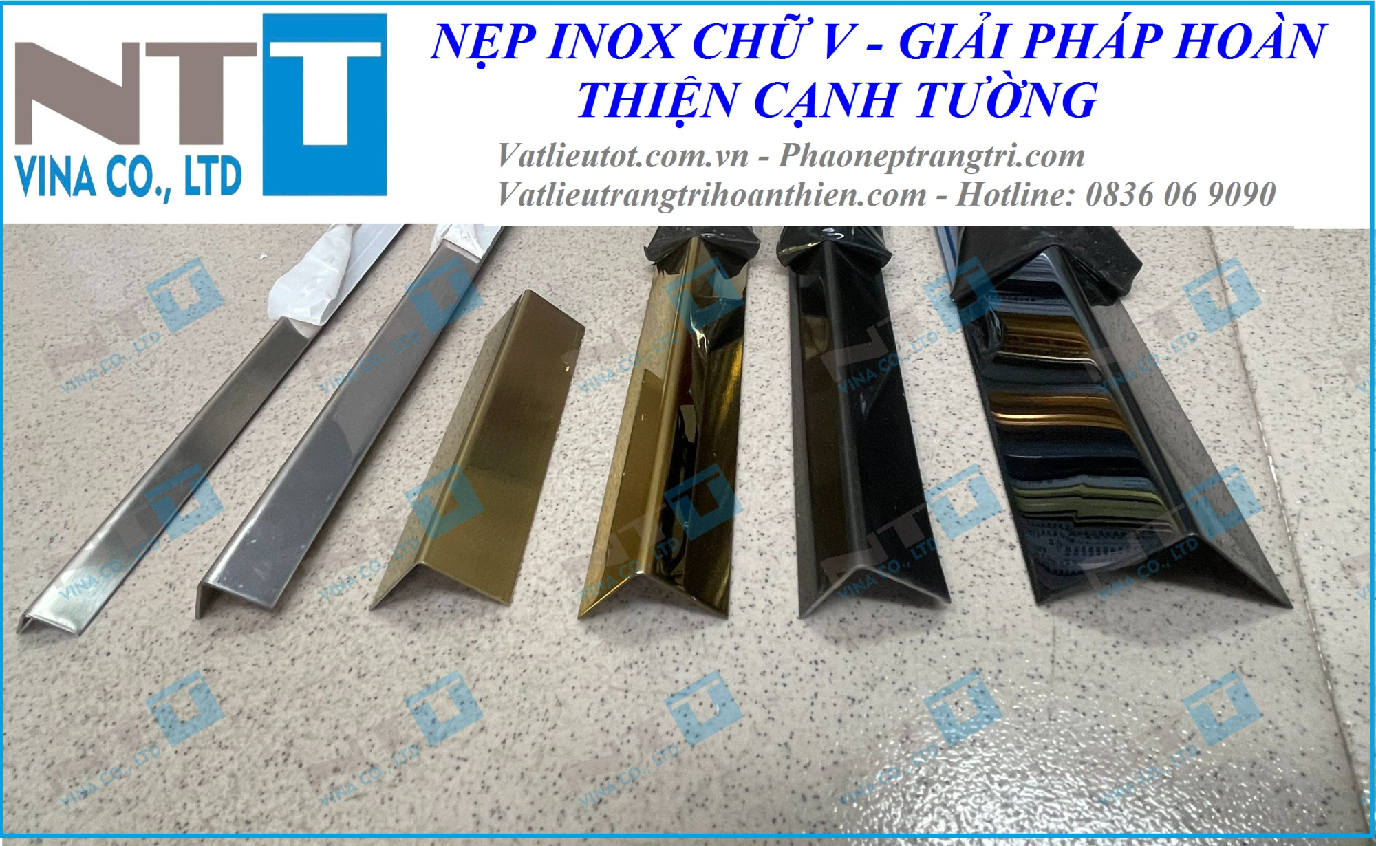 Nẹp inox chữ V là loại nẹp kim loại có tiết diện hình chữ V (góc 90 độ), dùng để ốp góc dương của tường, cột hoặc bậc tam cấp sau khi ốp gạch. Sản phẩm thường làm từ inox 304 hoặc inox 201.