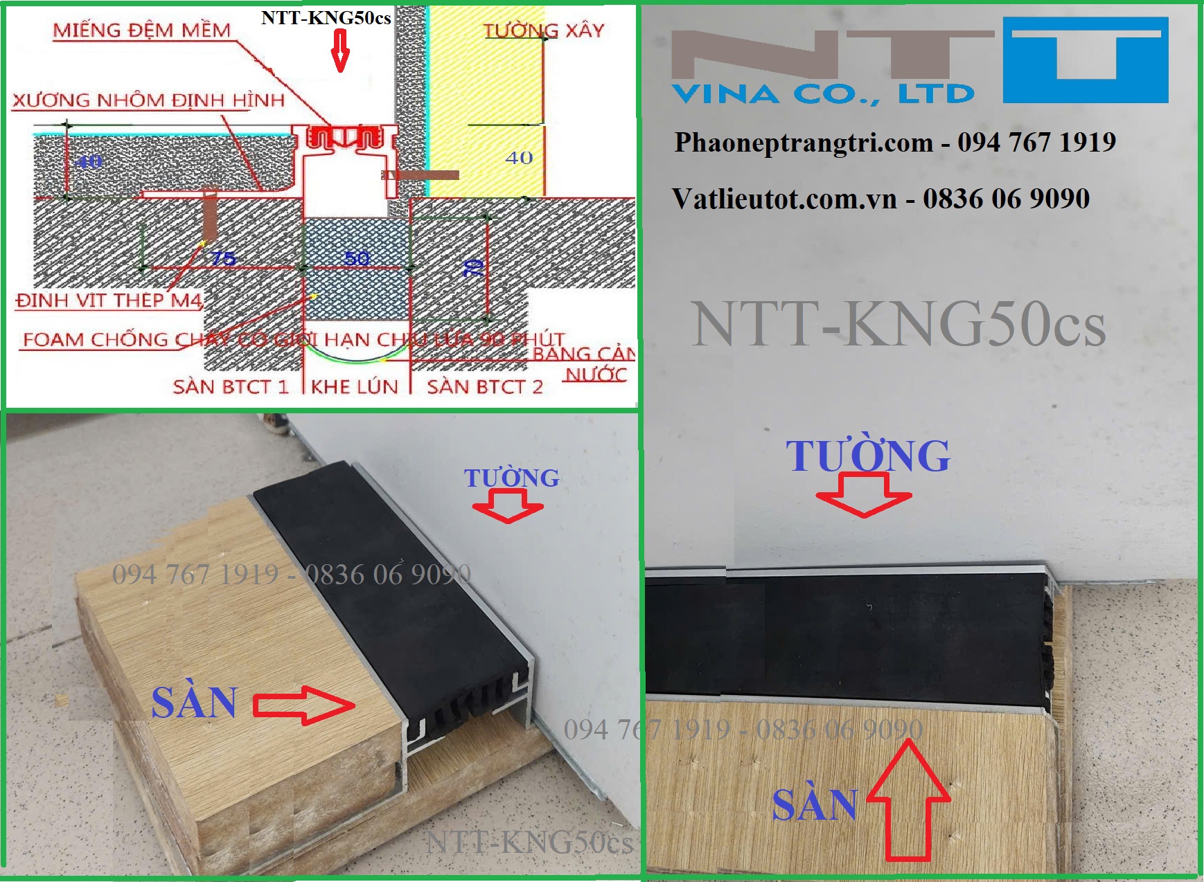 Nẹp khe lún góc tường NTT-KNG50cs gồm hai thanh ray nhôm chính gắn cố định vào tường và sàn bằng vít nở, cùng ron cao su EPDM đàn hồi giữ giữa hai thanh nhôm để chéo kín khe lún, khe co giãn hoặc khe nhiệt mà không làm mất tính năng kỹ thuật của khe.
